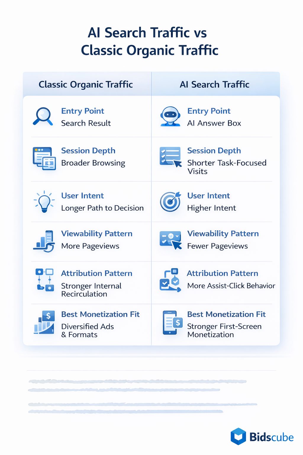 For publishers, this matters because the click happens later in the journey. The user has already read a summary, and the user arrives with a narrower goal. This shift affects AI search engine traffic monetization because attention is not distributed the same way.