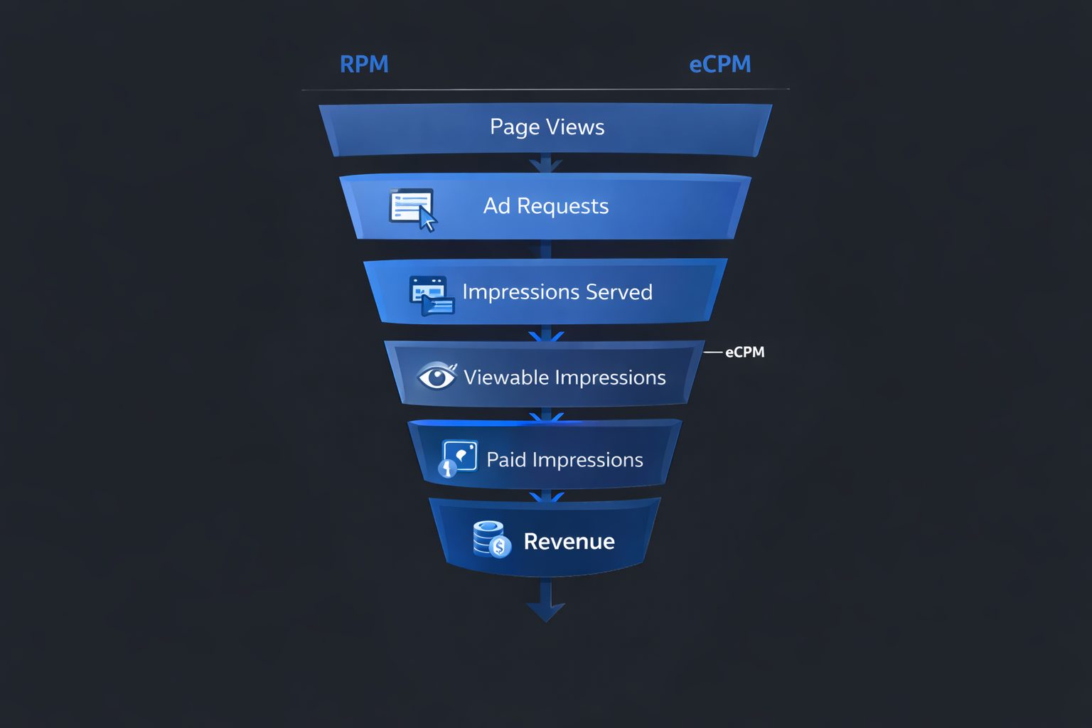 If you are trying to explain the gap between RPM and eCPM to a business team, use the page view funnel: page view to ad request to served impression to viewable impression to paid impression to revenue.