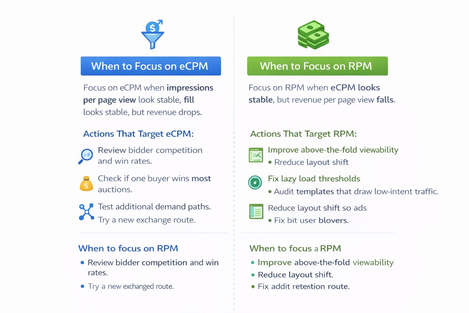 Focus on RPM when eCPM looks stable, but revenue per page view falls. That usually points to layout, viewability, or user behavior.